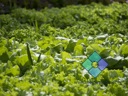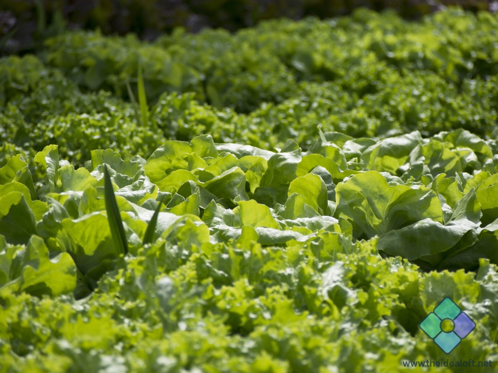 The image shows a close-up of green leafy vegetables, which appear to be lettuce or similar types of greens. The leaves are vibrant and fresh, with a slight dewiness indicating they may have been watered recently. The background is out of focus but seems to suggest an open field or garden setting. This image could be used for culinary purposes or as a stock photo for food-related content.