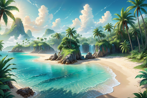 A vibrant and colorful digital artwork depicting a tropical island scene, featuring sandy beaches, clear turquoise waters, palm trees, waterfalls, and rock formations under a partly cloudy sky.