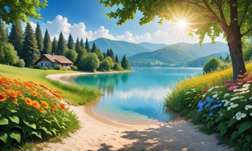 A tranquil landscape scene featuring a serene lake, surrounded by lush greenery, colorful flowers, and trees under a clear blue sky with the sun shining brightly at the horizon.