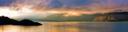 The image depicts a sunset over a calm body of water, possibly a lake or a bay. The sky is filled with clouds and the light reflects on the water's surface, creating a serene atmosphere. There are no people visible in the scene.