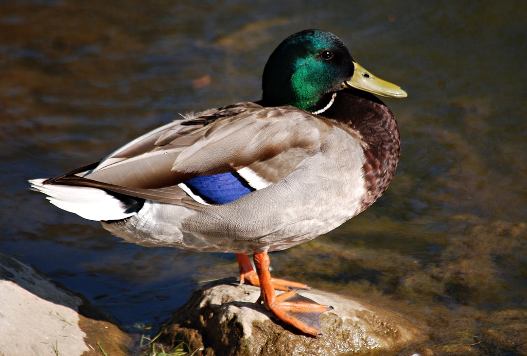 The image depicts a single mallard duck perched on a rock at the edge of a body of water, possibly a stream or river. The duck has its head turned to the side and is facing the camera with a calm demeanor. There are no other objects in the immediate vicinity. The background is natural and not cluttered, focusing solely on the duck.
