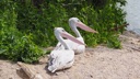 This image shows two pelicans on a beach. The birds are positioned close to each other, with their beaks touching, suggesting a sense of companionship or playfulness. They appear to be resting on the gravel near the water's edge. There is no explicit adult content, graphic violence, hate symbols, or illegal material in this image, making it safe for all audiences.
