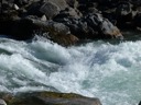 This image depicts a rocky creek with fast flowing water, possibly during winter or after heavy rain, given the foamy surface. The rocks surrounding the creek appear to be grey and jagged, suggesting a natural, untouched environment.