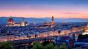 The image shows a picturesque view of Florence, Italy at sunset. The sky is painted with hues of orange and pink, casting warm light on the city's historic buildings. The landmark of Florence, the Cathedral of Santa Maria del Fiore (Duomo di Firenze) stands out prominently in the background along with the Campanile (Florence Bell Tower). The streets are lit up with soft light, and the overall ambiance suggests a peaceful evening in the city.