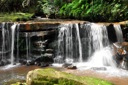 The image depicts a natural outdoor scene featuring a cascading waterfall. The water is flowing over rocks and moss, creating a serene and picturesque setting. There is lush greenery around the waterfall, indicating that this might be a rainforest or a similarly humid environment. It's a clear day with ample sunlight illuminating the waterfall's path down to the river below. The overall impression is one of tranquility and the beauty of nature.