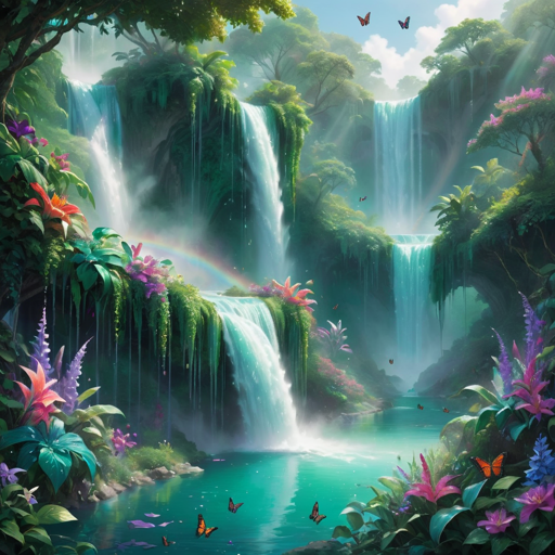 This image depicts an enchanting and vibrant waterfall surrounded by lush greenery, with cascading waterfalls in the background. A rainbow arches over the top of the falls, adding a mystical element to the scene. The foreground shows colorful flowers blooming amidst the dense foliage, and butterflies are seen fluttering about, contributing to the overall natural beauty and serenity of the landscape.