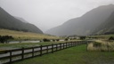 The image captures a serene landscape during what appears to be either early morning or late afternoon, given the soft, diffused lighting. The scene is dominated by a mountainous terrain with a forested area in the foreground and a river flowing through it. A wooden fence runs parallel to the river, suggesting a boundary between areas of different use. The overall atmosphere is peaceful and naturalistic.