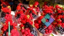 The image shows an outdoor market scene, focusing on two tables laden with various types of berries and possibly other fresh produce as well. The tables appear to be set up for customers to purchase the items, possibly a farmers market or similar setting. There is no explicit adult content, graphic violence, hate symbols, or illegal material visible in the image.