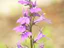 The image features a close-up of a purple wildflower, showcasing its delicate petals and stamen on a thin stem against a blurred natural background.
