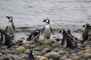 The image shows a group of penguins on rocks near the water's edge, possibly at a beach. The penguins appear to be resting or playing as they stand and walk around each other.