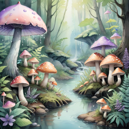 A fantastical forest scene featuring colorful mushrooms growing on rocks and along a stream bank.
