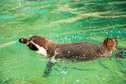 This is an image of a penguin swimming in water, possibly at a beach or a coastal area. The penguin appears to be young and its coloring suggests it might be a baby or juvenile.