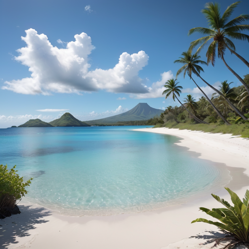 This is a panoramic image of a beautiful tropical beach. In the background, there is a large volcano on the left side and clear blue skies above.