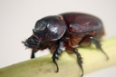 The image shows a single beetle sitting on a banana peel. The beetle is dark red in color and appears to have a shiny exoskeleton, indicating it may be wet or recently emerged from water. It has six legs that are visible and two antennae at the head, which are used for sensing its environment.