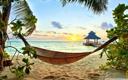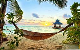 This is an image of a serene beach scene at sunset. There's a hammock positioned in front of the viewer, providing a perfect spot for relaxation. The ocean extends to the horizon, and there are palm trees visible on both sides of the view.