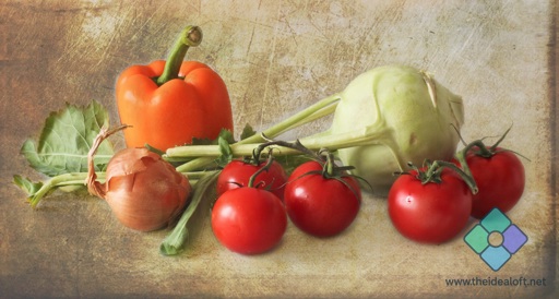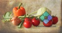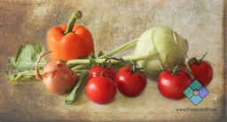 The image shows an assortment of fresh vegetables on a table, including tomatoes and peppers. The colors are vibrant and there's a rustic texture overlaying the photo, giving it an aged look.