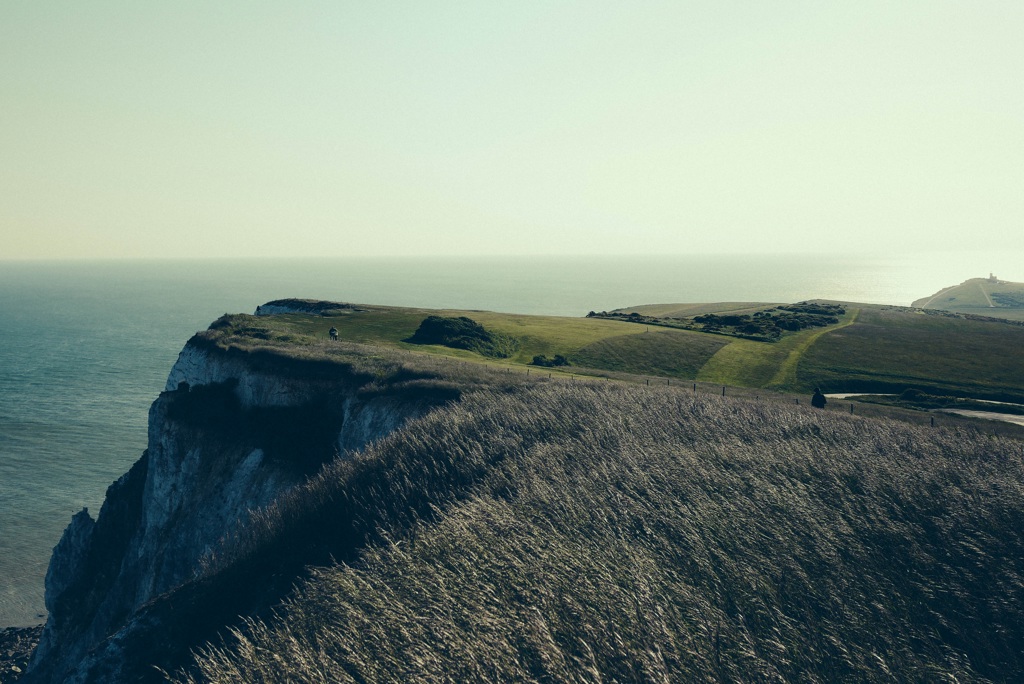 The image shows a scenic coastal landscape with cliffs and vegetation. There is a faint figure of a person on the right, standing on the edge of the cliff. The sky is clear, suggesting it might be early morning or late afternoon due to the warm lighting.
