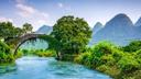 A natural scene of mountains, a river, and vegetation with a bridge in the background, set against a clear sky.