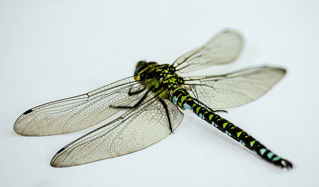 The image features a large dragonfly resting on a white surface, with its wings extended and body angled in such a way that it resembles a fighter jet in flight.