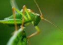 Close up photo of a green grasshopper on a leafy plant, possibly in a forest or jungle environment.