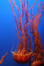 The image is of an underwater scene featuring two jellyfish, each surrounded by long red tentacles. The tentacles extend outward from the jellyfish bodies, creating a vivid contrast against the deep blue background. There are no other objects or creatures visible in the image.