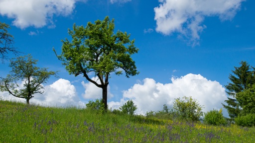 A vibrant meadow under a clear blue sky, dotted with fluffy white clouds. Trees and bushes line the horizon, framing the sunny landscape.