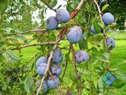 The image shows a branch of an apple tree filled with ripe blueberries, which appear to be plump and ready for picking.