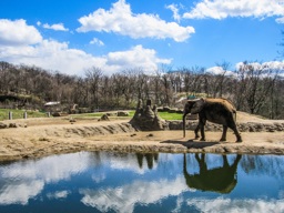 An elephant stands on the edge of a body of water, possibly an enclosure or sanctuary setting with trees in the background.