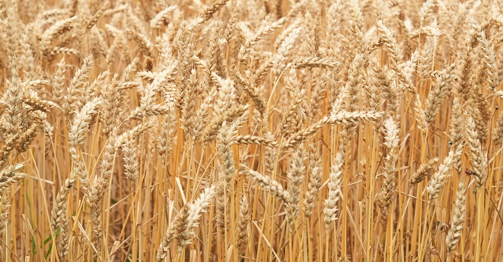 The image shows a field of golden wheat, likely taken during harvest season due to the coloration and texture of the wheat stalks.