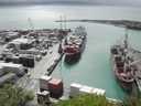 The image shows a large maritime container port with multiple cargo ships docked at piers. The sky is overcast, suggesting it might be a cloudy day. There is visible activity of cargo handling equipment and vehicles within the port premises.