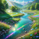 This image depicts an idyllic and vibrant countryside scene with a river, green hills, and a rainbow arching over the water. The weather appears to be clear, sunny, and possibly early morning or late afternoon, given the golden light cast on the scene. There are no texts present in the image.