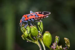 The image shows a vivid red and black beetle perched on a plant. The beetle is focused on the plant, possibly feeding or inspecting it.