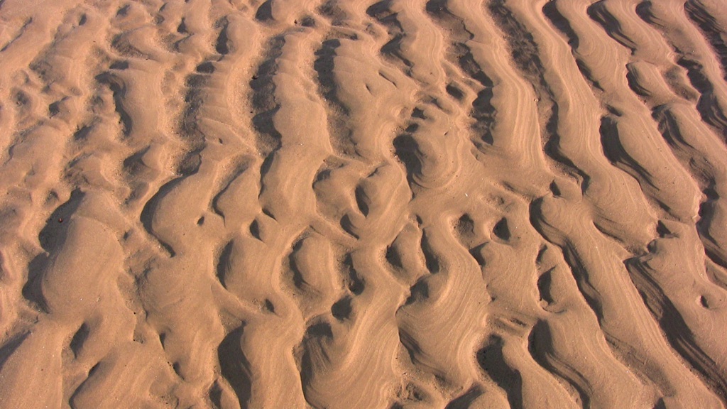 A close up view of sand on a beach, showing the texture and ripples in the sand from wind or water movement.