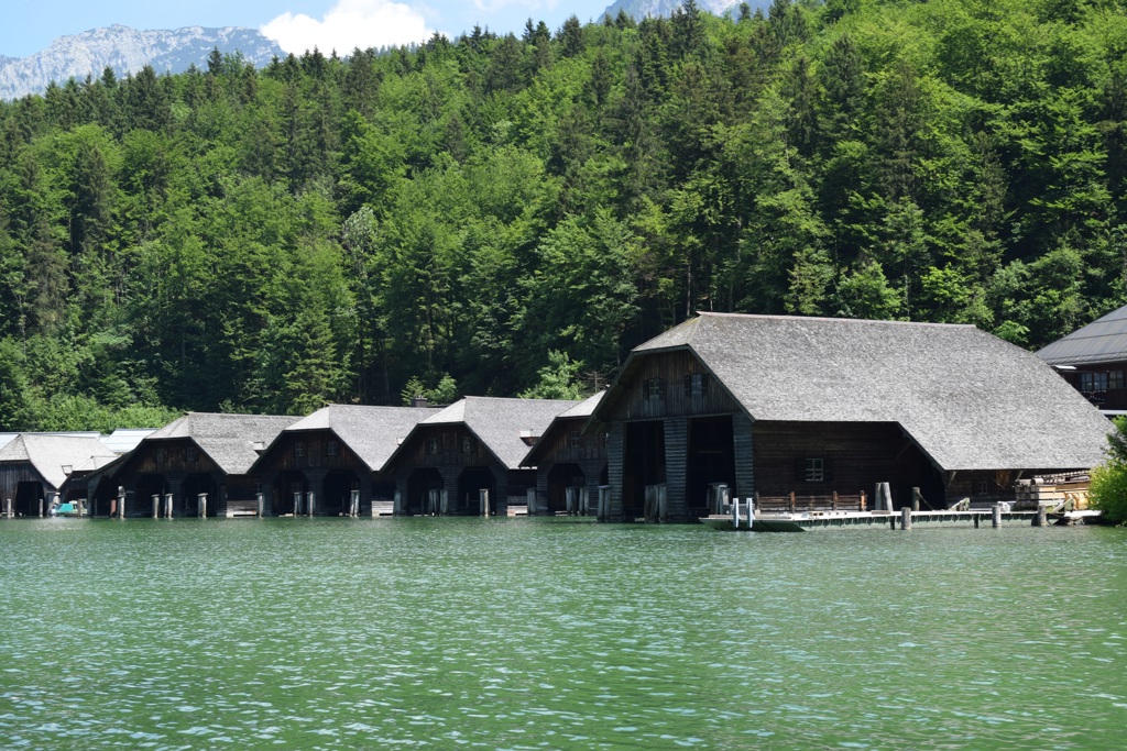 The image shows a row of wooden buildings situated along a body of water, likely a lake or river. The architecture is traditional and rustic, with visible thatched roofs and exterior walls made from logs.