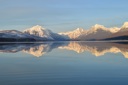 A beautiful tranquil mountain lake at sunrise or sunset, reflecting the majestic peaks in its mirrored surface.