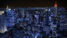 The image captures a nighttime scene of a bustling cityscape, possibly New York City given the distinctive skyline with iconic buildings such as the Empire State Building and One World Trade Center illuminated against the dark sky. The streets are dense with light from various sources including streetlights, traffic lights, and building windows, giving the scene a vibrant yet chaotic energy. The perspective is at ground level, looking up towards the towering buildings, which creates an interesting contrast between human-made structures and the natural night sky.