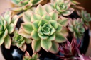 The image is a close-up photograph of succulent plants, specifically cacti or succulents with spiny features, and one large flower with red edges in the center. The arrangement appears to be in pots on a surface, possibly indoors due to the artificial lighting reflected on the glass table top beneath them.