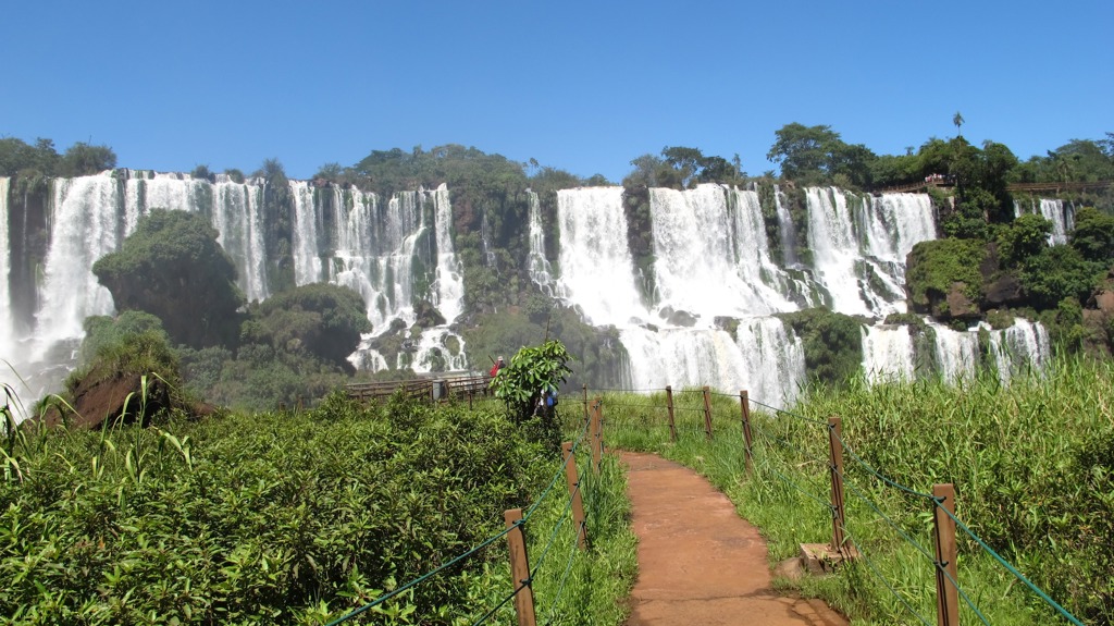 The image captures the breathtaking view of Iguazu Falls, one of the largest waterfalls in the world. The vantage point is from a trail that leads up to the cascade, allowing for an unobstructed view of the falls and the surrounding lush greenery.