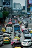 The image shows a bustling city street filled with traffic. There are multiple vehicles, including cars, buses, and motorcycles, all moving in the same direction on a multi-lane road. Buildings rise on both sides of the street, indicating an urban environment. The scene suggests a typical day in a busy metropolis, with people possibly commuting to work or other daily activities.