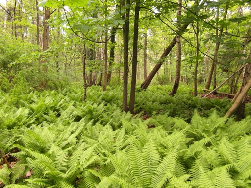 The image depicts a lush forest with a dense growth of ferns, creating a green and verdant scene. The ground is covered with various plants and there are trees in the background that are partially obscured by the canopy above.