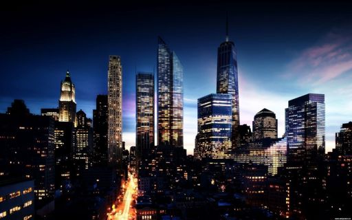 The image shows a nighttime view of Manhattan, New York City. Tall skyscrapers with various lights and reflections from the buildings create a dense urban skyline. The colors in the photo are warm tones with blues and purples suggesting a twilight or early evening time.