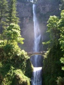 A natural setting showing a picturesque waterfall and lush greenery, with a bridge overlooking the falls.