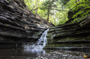 The image is of a serene natural setting featuring a small waterfall in a narrow slot canyon, surrounded by lush greenery and foliage. The terrain is rugged with steep cliff walls on either side of the waterfall, which appears to be flowing gently. There are no signs of human activity or development visible in this scene, giving it a sense of tranquility and remoteness.