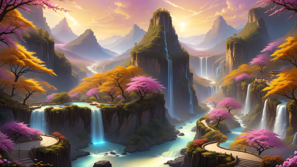A vibrant waterfall scene set against a mountainous landscape at sunset, bathed in warm and cool hues.