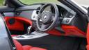 The image shows the interior of a luxury sports car. The dashboard features sleek design elements and the steering wheel is also adorned with various controls, indicative of a high-end vehicle. The seats are red and black, adding to the sporty aesthetic. There's no sign of explicit adult content or other inappropriate material visible in this image.