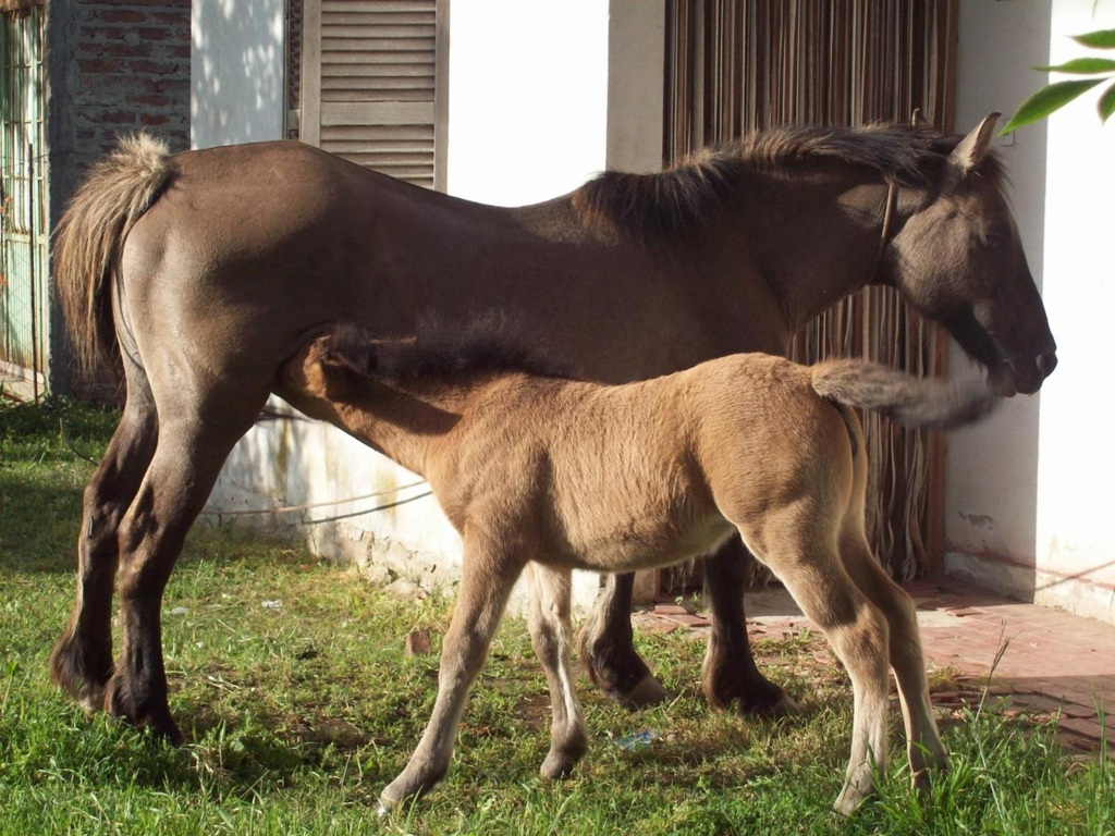 The image shows two horses, an adult and a foal, in an outdoor setting that appears to be a yard or pasture with grass and a wall visible in the background.