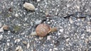 The image shows a small metal button lying on its side on what appears to be an asphalt road or pavement, with scattered stones around it. The button has some engravings that seem to include text and possibly a shield design, but the specific details are not clear due to the image's quality and angle.