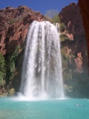 The image depicts a beautiful clear day at Horseshoe Bend, which is located near Page, Arizona. A large waterfall cascades over the cliff edge into the blue green river below, creating a picturesque view.