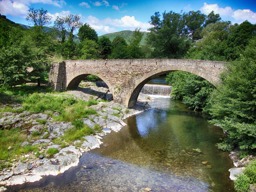 The image depicts a quaint stone bridge spanning over a small, flowing body of water with rocks and greenery surrounding it. The sky is partly cloudy, suggesting a bright but not harsh day. The bridge has an arched design typical of traditional European construction.