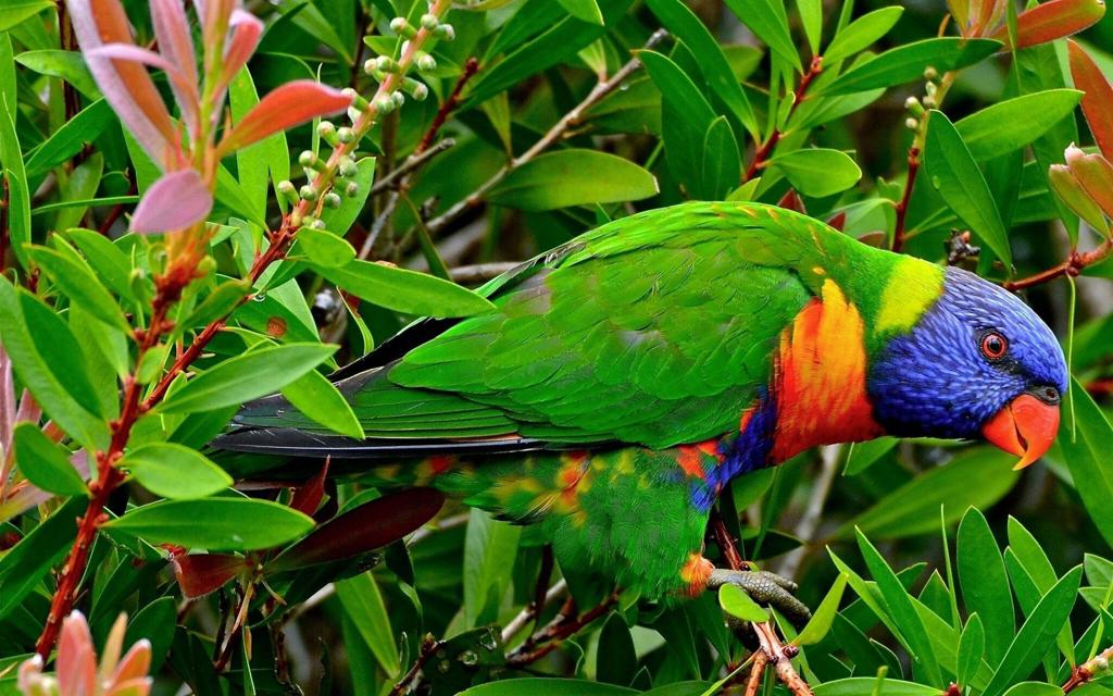 The image depicts a colorful parrot perched on the branches of a tree. The bird has vibrant feathers with hues of green, blue, yellow, and red. It appears to be in its natural habitat among lush green foliage.